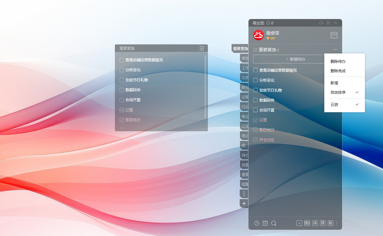 敬业签时间轴历史日志记录轻松找回误删除的便签待办记录敬业签是一款跨系统、跨设备可实现电脑手机多端云同步的桌面便签、待办事项任务清单的软件,使用同一个敬业签帐号任意一端登录敬业签,即可实现任意端记录的便签内容、待办事项任务清单,自动云同步到其他多端,而且支持设置定时提醒通知及时间轴功能轻松通过保存的日志记录找回误删除的便签、待办历史数据。