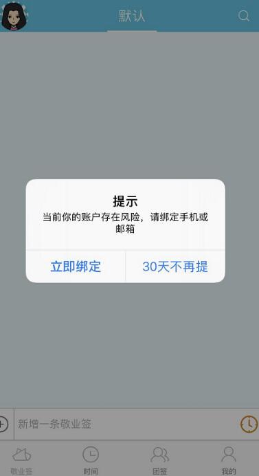 四、如果直接使用QQ号码进行新用户注册,登录敬业签成功后会有“当前账户存在风险,建议绑定手机或邮箱”的提示,建议立即绑定。