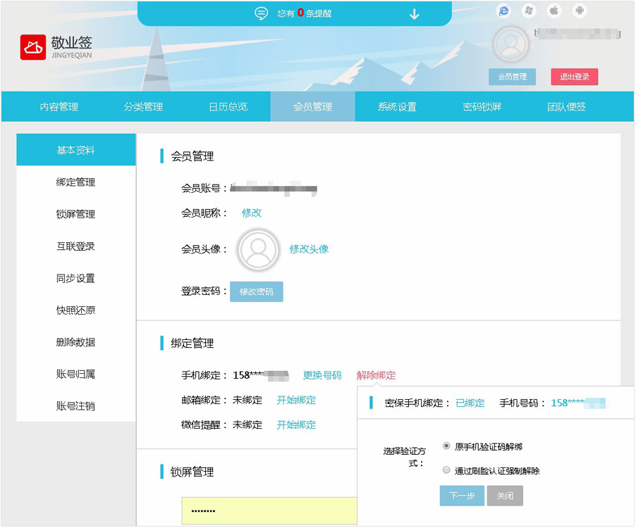 二、在Web网页版个人便签页面,点击“会员管理”功能,找到绑定管理列表里的“手机绑定”,点击其后面的“解除绑定”;