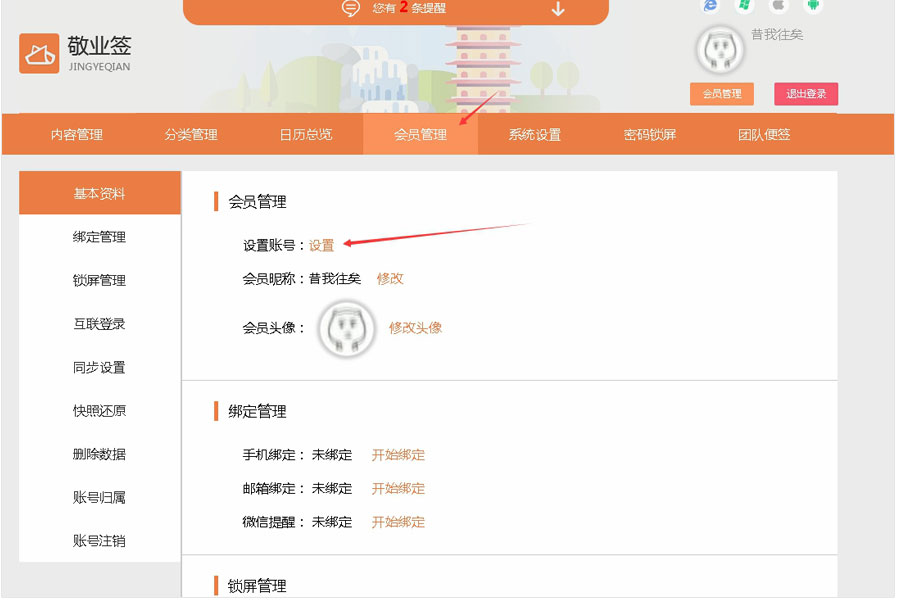 三、点击顶部的会员管理,在会员管理基本资料中找到“设置账号”,点击其后面的设置按钮;