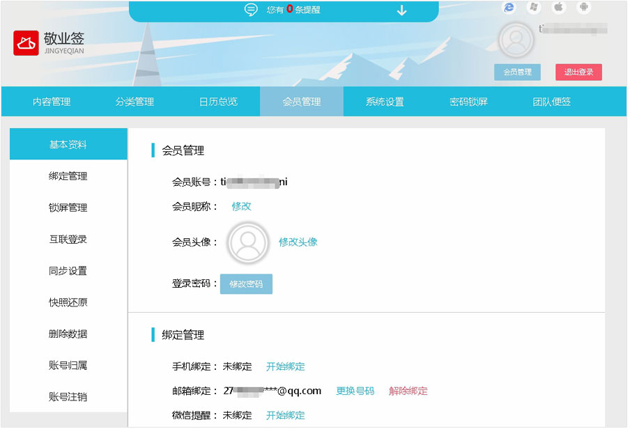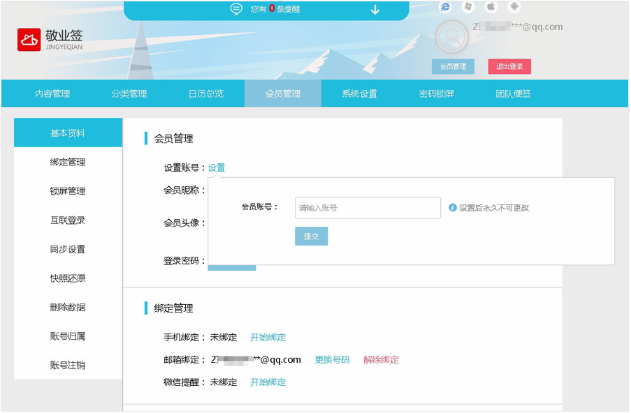 用户设置完成后,在以后登录敬业签Web网页版账号时,不仅可以使用邮箱账号作为登录用户名登录敬业签,还可以通过设置的会员个性账号名称进行登录,同步共享邮箱登录账号里记录的便签内容。