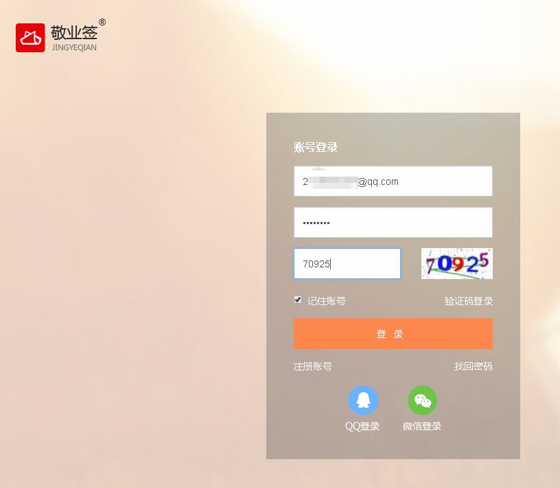 二、输入注册敬业签账号时所使用的邮箱或者已绑定敬业签账号的邮箱,同时输入密码以及图片验证码上的数字;