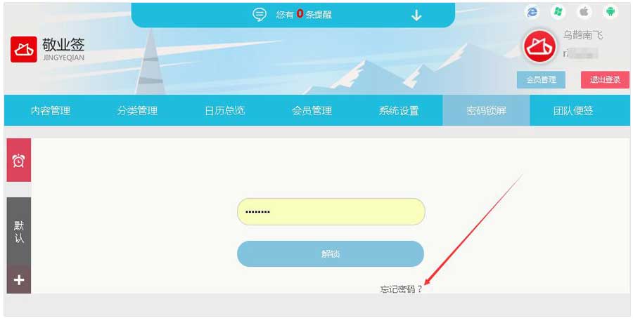 敬业签Web网页版支持密码锁屏功能,用户可以设置敬业签的锁屏密码,将网页版上记录的便签内容进行加密。当使用微信或者QQ互联登录敬业签Web网页版的用户忘记了设置的锁屏密码时,应该如何操作呢?