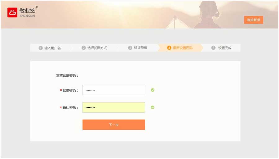 五、提示微信/QQ认证成功,重新设置敬业签账号的锁屏密码,并确认密码,点击下一步;