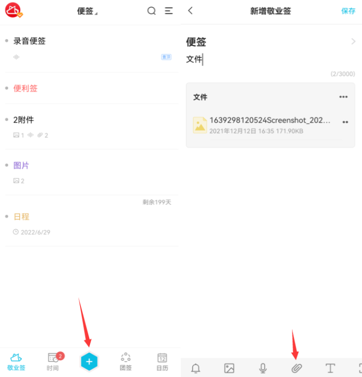 打开手机敬业签便签软件并登录账号,点击主页面底部中间的+按钮,可进入新增内容编辑页面,点击底部回形针形状的文件上传按钮,将手机里面的文件添加到云便签中,单条便签内容可上传10个文件,上传成功后还能对其添加文字备注,点击保存后即可添加成功。