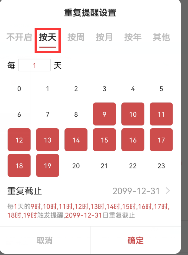 注意:按天重复提醒设置后,会每天按照您设置的时间提醒您,如您不需要每天提醒,可通过“重要事项”完成间隔提醒设置。