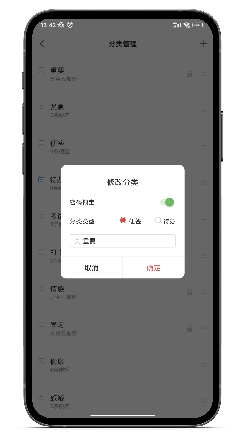 敬业签是支持创建分类,并可以对特定分类设置密码锁的。你可以将较为敏感的信息存储在一个特定的分类中,然后利用密码将其保护起来。而且即便你在使用中将其解锁,手机端只要关闭APP该分类便会自动复锁,电脑端则可以设置30分钟或切换分类复锁,彻底杜绝敏感信息被别人查看的可能。