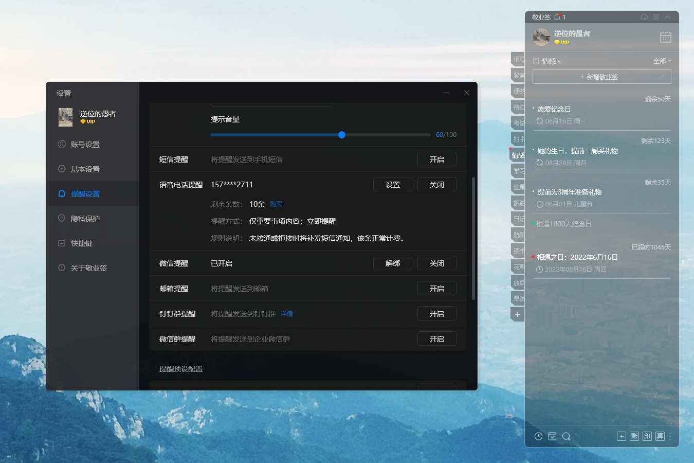 还有,敬业签的提醒渠道也十分丰富。除了响铃、弹窗、震动这些基础方式外,还可以通过微信、钉钉、邮箱、短信、语音电话这些第三方工具进行通知,让你无论身处何处都能收到提醒。