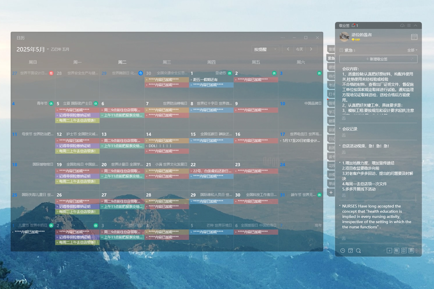 敬业签是一款桌面便签软件,内含一款很好用的桌面日历。日历可以通过嵌入桌面和调节透明度完美适配桌面背景,让它长时间在桌面上显示也不突兀。同时你在敬业签内安排的所有日程提醒,都会在日历上显示,需要编辑或新增提醒时直接在日历上双击即可,非常方便。